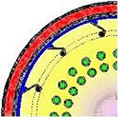 刮膜片型式為徑向滑動(dòng)型,它由WFE-VA 刮膜蒸發(fā)器演變而來;刮片鑲嵌在轉(zhuǎn)子的U導(dǎo)槽內(nèi),當(dāng)轉(zhuǎn)子旋轉(zhuǎn)是時(shí)刮片受離心力的作用從U導(dǎo)槽內(nèi)徑向滑到加熱壁面。導(dǎo)槽均勻分布在轉(zhuǎn)子圓周(見圖1),轉(zhuǎn)子呈鼠籠型,在導(dǎo)槽之間設(shè)有動(dòng)態(tài)汽液分離裝置,防止液滴的飛濺及夾帶。